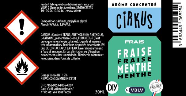 L’arôme concentré Fraise Menthe Cirkus combine la douceur d'un duo de fraises à une base aromatique intense composée de menthe blanche, d'eucalyptus et d'anis. Une recette équilibrée aux nuances végétales et fruitées. Flacon de 30 ml.