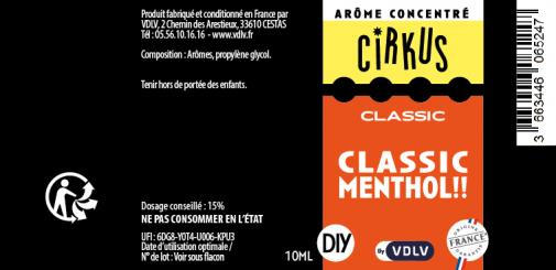 L'arôme concentré "Classic menthol" de Cirkus associe un tabac blond de caractère à la puissance rafraîchissante du menthol. Une saveur équilibrée et authentique, fabriquée en France par VDLV pour vos préparations DIY Flacon de 10 ml.