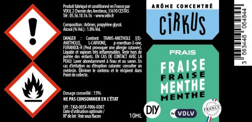 L'arôme concentré "Fraise Menthe" de la gamme Cirkus est classé dans la famille des saveurs fraîches. Il délivre un duo de fraises enveloppé par une vague de menthe blanche, d'eucalyptus et d'anis.