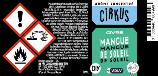 L'arôme concentré "Mangue de Soleil" de la gamme Cirkus est classé dans la famille des saveurs Givrées. Il propose une mangue gorgée de soleil soutenue par un ananas juteux et rafraîchie par un alizé caribéen, offrant une expérience aromatique équilibrée entre la douceur sucrée des fruits exotiques et une brise légère.