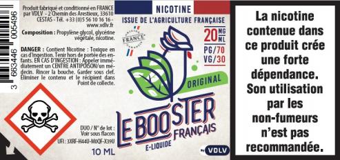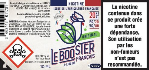 - L’utilisation du Booster Français doit se faire dans un cadre strictement sécurisé et par des personnes averties. Respectez les dosages conseillés et les précautions d’emploi : la nicotine est un produit toxique par voie cutanée, même diluée. Elle doit être manipulée avec beaucoup de précaution. Portez toujours des gants et des lunettes de protection lorsque vous manipulez les bases PG/VG. Elles doivent être gardées sous clef et tenues hors de portée des enfants.