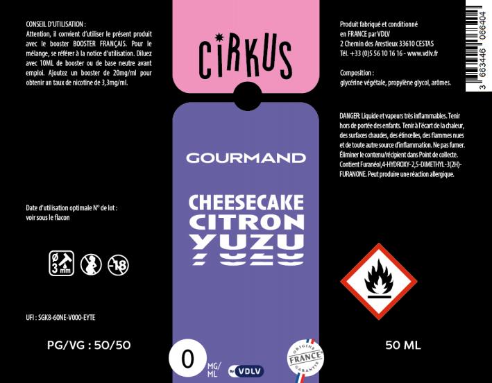 L'e-liquide Cheesecake Citron Yuzu de Cirkus reprend les codes d'une pâtisserie onctueuse mariant la générosité d'un cheesecake crémeux à la vivacité du citron frais et du yuzu acidulé. Prêt à Booster (PAB) au profil aromatique gourmand élaboré sur une base PG/VG 50/50. Format 50 ml sans nicotine.