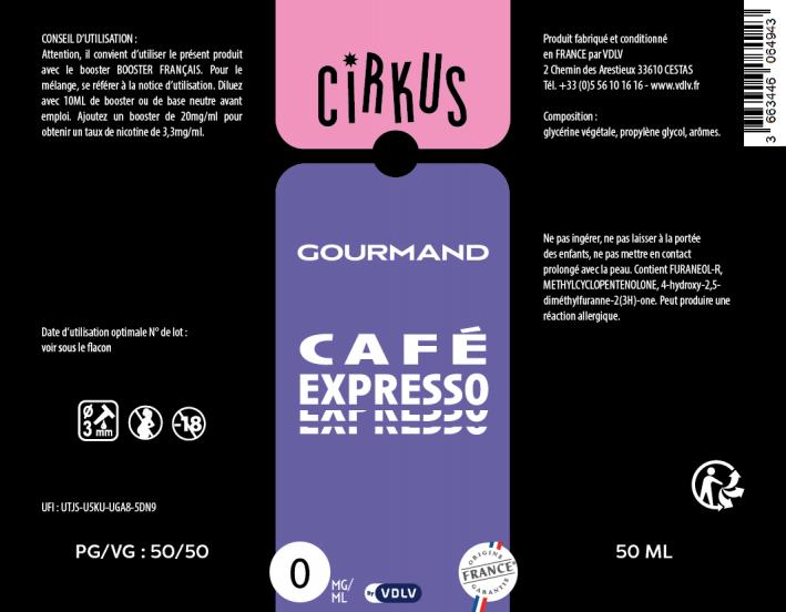 L'e-liquide "Café Expresso" de la gamme Cirkus est une composition aromatique classée gourmande. Il propose le goût fidèle d'un café arabica servi court et serré. Ce grand format est un Prêt à Booster (PAB), conditionné dans un flacon de 70 ml rempli à 50 ml d'e-liquide sans nicotine (). Ceci laisse l'espace nécessaire pour l'ajout d'un ou plusieurs boosters de nicotine ().
