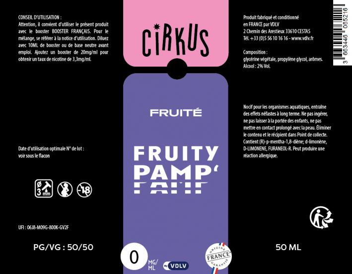 L'e-liquide Cirkus "Fruity Pamp'" est produit dans les laboratoires VDLV, situés près de Bordeaux, garantissant une fabrication 100% française. Le ratio PG/VG 50/50 assure un équilibre optimal saveur/vapeur. Élaboré avec du propylène glycol et de la glycérine végétale de qualité PE et des arômes vapologiques garantis sans Diacétyle, Paraben, Ambrox.