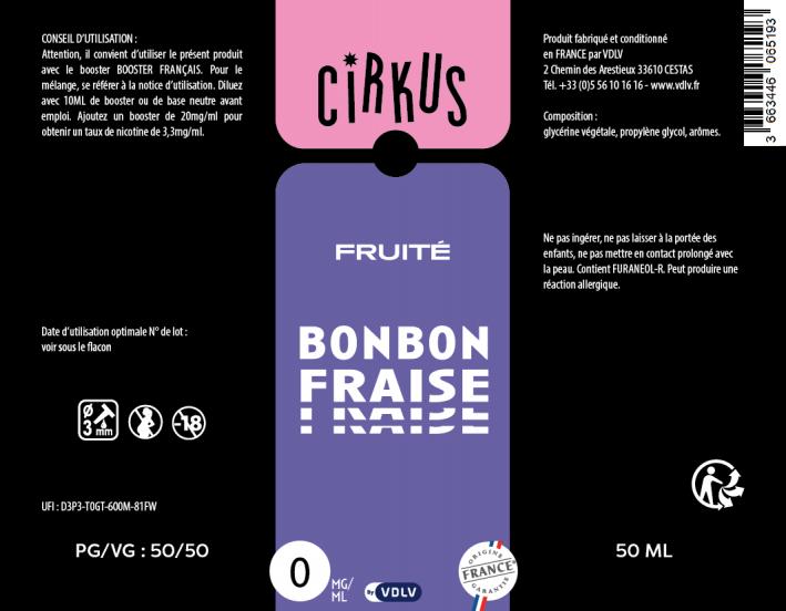 L'e-liquide Cirkus "Bonbon Fraise" est produit dans les laboratoires VDLV, situés près de Bordeaux, garantissant une fabrication 100% française. Le ratio PG/VG 50/50 offre un équilibre idéal pour le rendu des saveurs fruitées. Élaboré avec du propylène glycol et de la glycérine végétale de qualité PE et des arômes vapologiques garantis sans Diacétyle, Paraben, Ambrox.