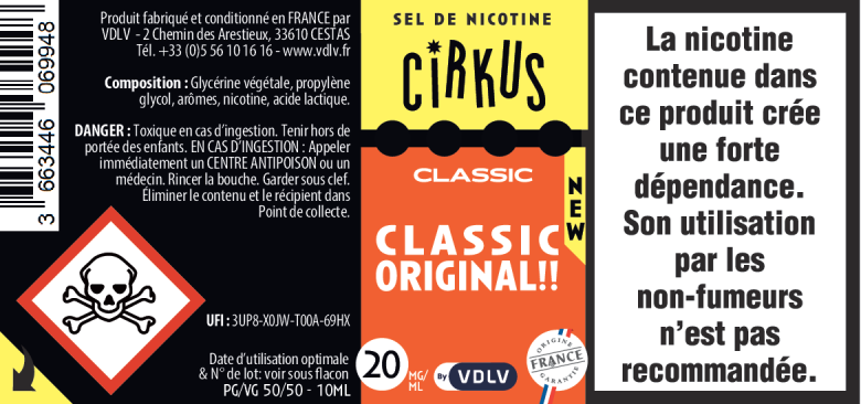 Le e-liquide Classic Original de la gamme Cirkus a été conçu pour ceux qui recherchent une saveur de classic authentique. Ce produit, fabriqué en France par VDLV, respecte des normes de qualité strictes.