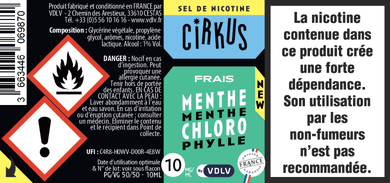 Comme tous les produits VDLV, nos e-liquides aux sels de nicotine Cirkus sont fabriqués en France. La nicotine vapologique que nous utilisons est issue de feuilles de tabac cultivées localement, assurant une traçabilité et une qualité optimales.