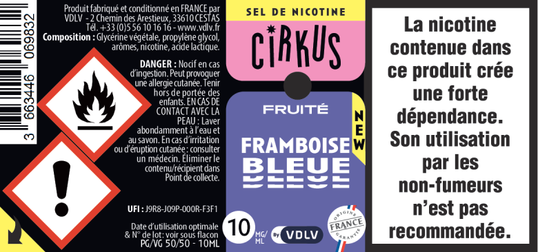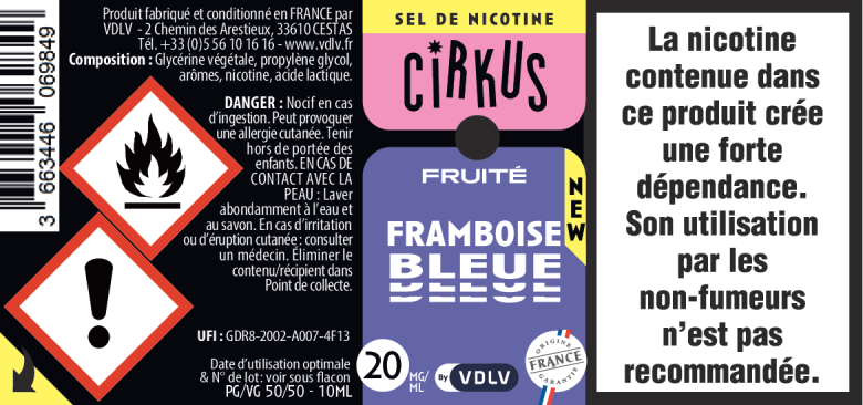 Comme tous les produits VDLV, nos e-liquides aux sels de nicotine Cirkus sont fabriqués en France. La nicotine vapologique que nous utilisons est issue de feuilles de tabac cultivées localement, assurant une traçabilité et une qualité optimales.