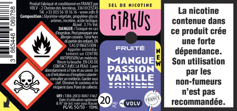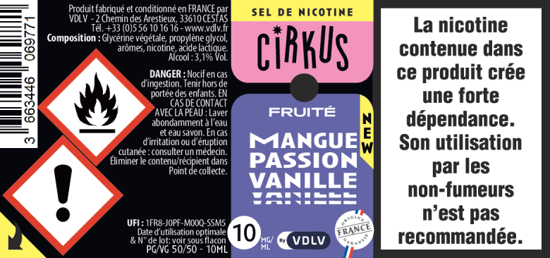 Comme tous les produits VDLV, nos e-liquides aux sels de nicotine Cirkus sont fabriqués en France. La nicotine vapologique que nous utilisons est issue de feuilles de tabac cultivées localement, assurant une traçabilité et une qualité optimales.