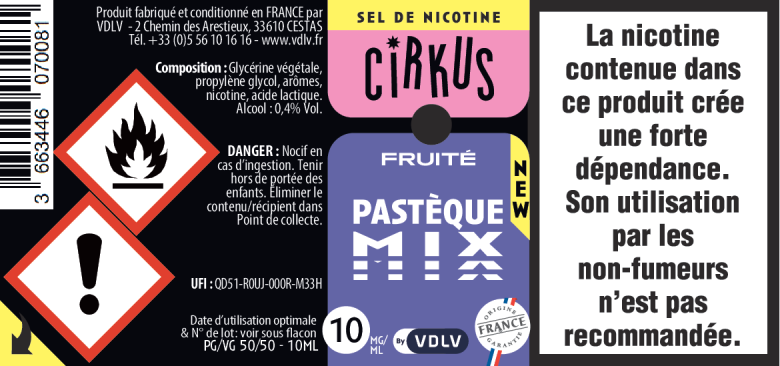 Comme tous les produits VDLV, nos e-liquides aux sels de nicotine Cirkus sont fabriqués en France. La nicotine vapologique que nous utilisons est issue de feuilles de tabac cultivées localement, assurant une traçabilité et une qualité optimales.