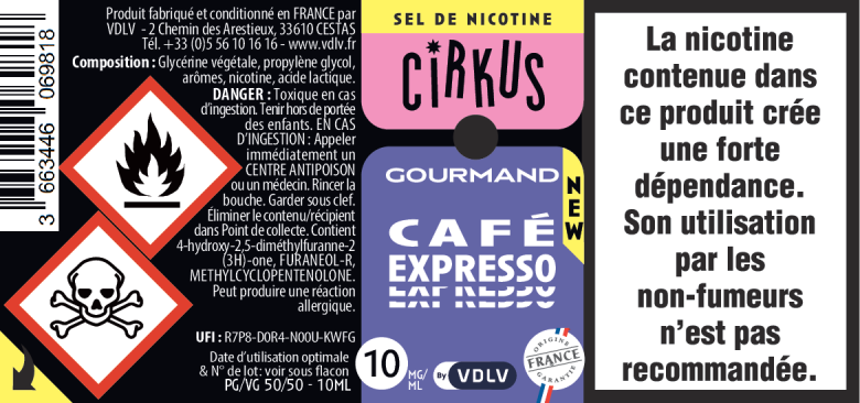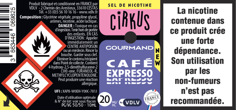 Comme tous les produits VDLV, nos e-liquides aux sels de nicotine Cirkus sont fabriqués en France. La nicotine vapologique que nous utilisons est issue de feuilles de tabac cultivées localement, assurant une traçabilité et une qualité optimales.