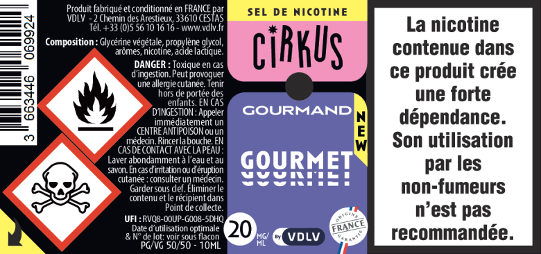 Comme tous les produits VDLV, nos e-liquides aux sels de nicotine Cirkus sont fabriqués en France. La nicotine vapologique que nous utilisons est issue de feuilles de tabac cultivées localement, assurant une traçabilité et une qualité optimales.