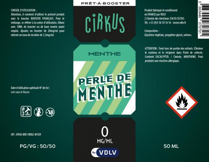L'e-liquide Cirkus "Perle de Menthe" est fabriqué dans les laboratoires VDLV en Nouvelle-Aquitaine, garantissant une fabrication 100% française. Le ratio PG/VG 50/50 assure un équilibre optimal saveur/vapeur. Élaboré avec du propylène glycol et de la glycérine végétale de qualité PE et des arômes vapologiques garantis sans Diacétyle, Paraben, Ambrox.