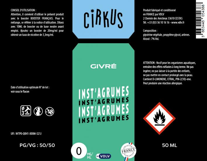 Les e-liquides 50ml Cirkus sont sans nicotine, boostés en arômes et conditionnés en flacons de 70 ml pour que vous puissiez venir les compléter avec un Booster Français afin d'obtenir un taux de nicotine de 3.33mg/ml en grand format