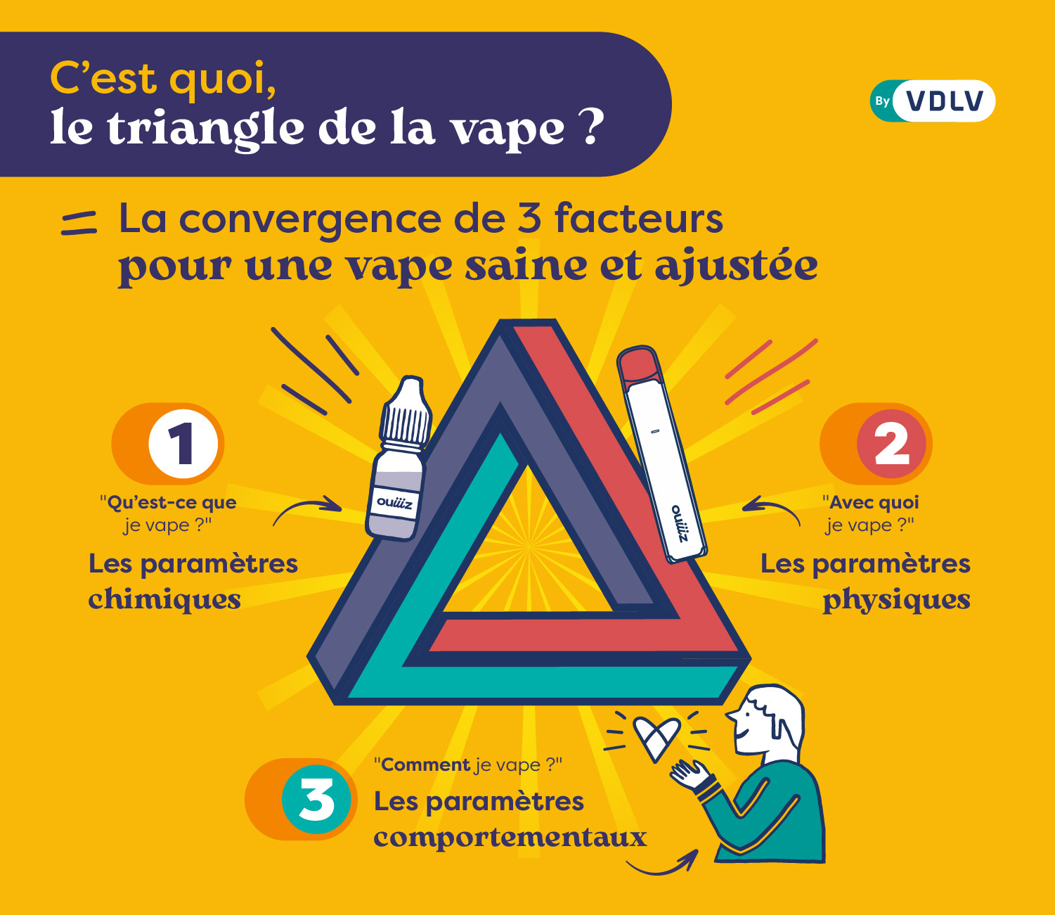 C'est pourquoi, VDLV a développé le concept du « Triangle de la Vape », un équilibre parfait entre trois piliers fondamentaux. La défaillance de l'un de ces piliers compromet l'expérience globale :